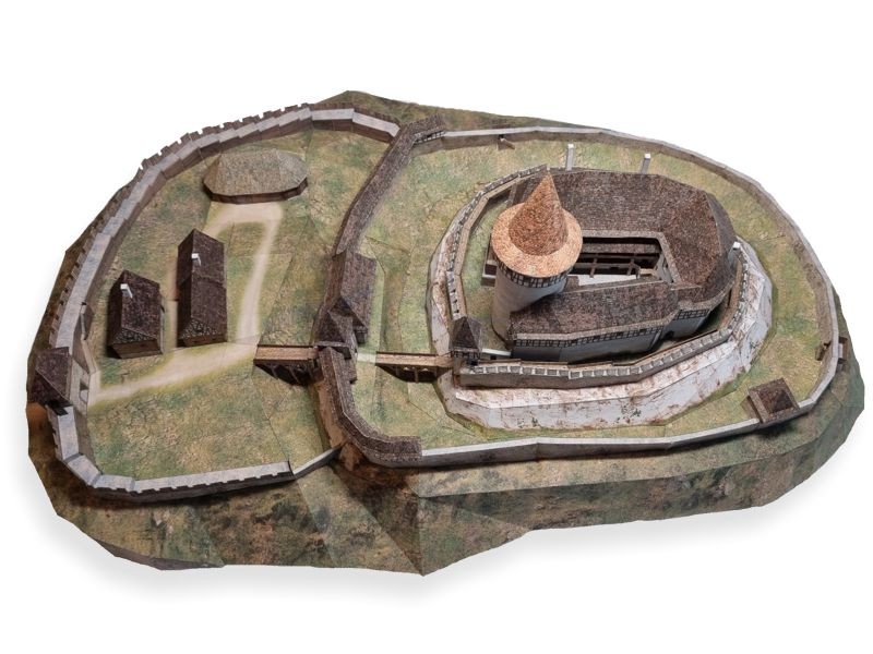 as a bergfrit, approximately 25 meters high, located in the northwest corner of the castle above the access road. The castle was entered through two gates with drawbridges. After crossing the second bridge, we come to the outer bailey, which is located between the ramparts