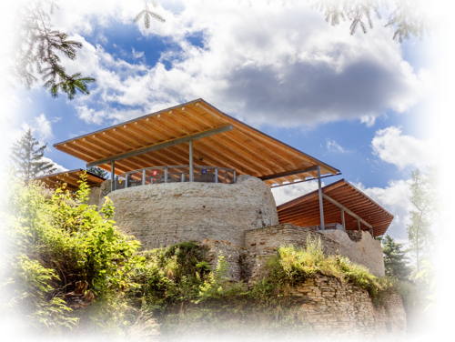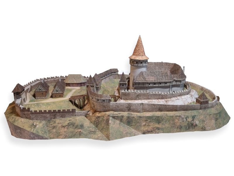 as a bergfrit, approximately 25 meters high, located in the northwest corner of the castle above the access road. The castle was entered through two gates with drawbridges. After crossing the second bridge, we come to the outer bailey, which is located between the ramparts